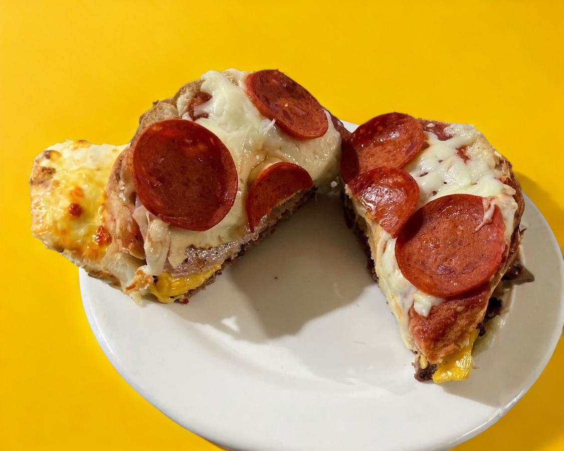Pan,salsa de tomate,90gr carne de res,queso martillo,tocino, extra queso blanco