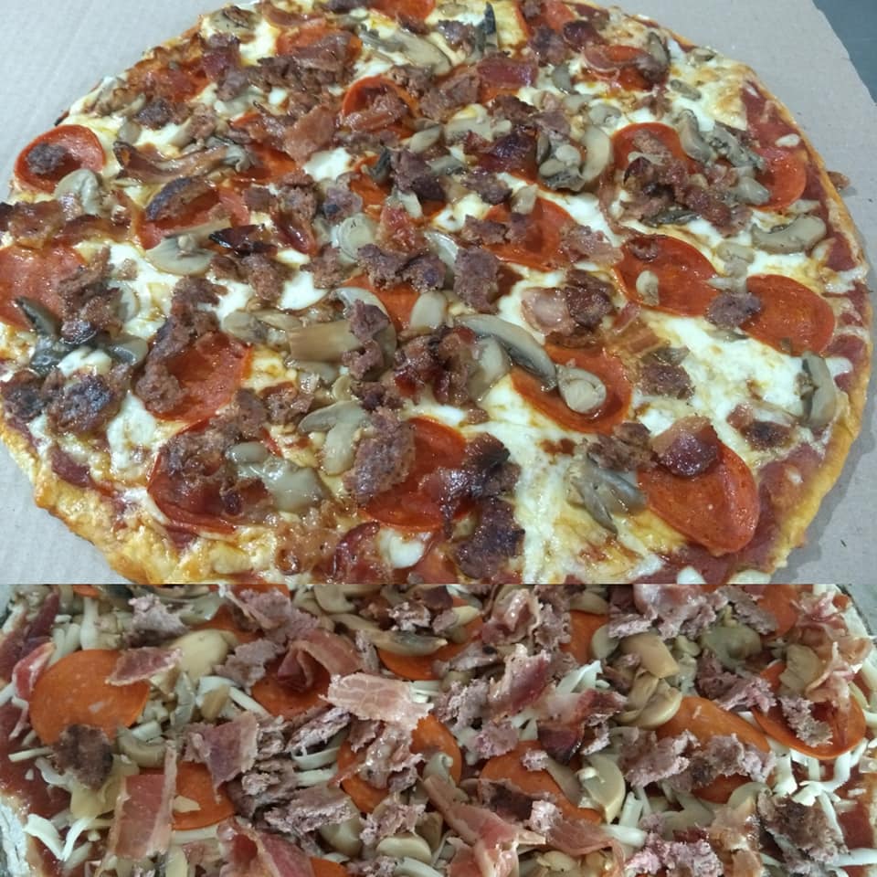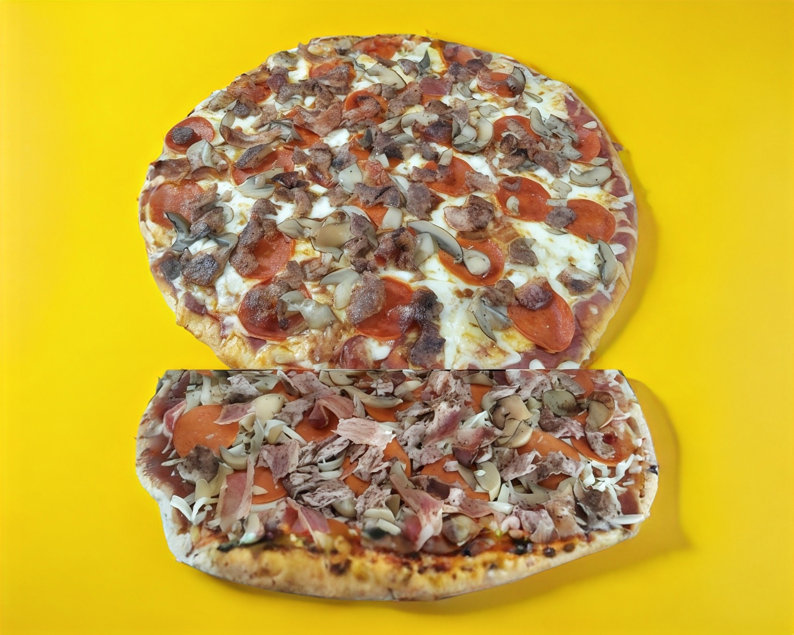 pizza mediana 12" 8 porciones , cubierto con salsa de tomate ,queso y peperoni.incluye aderezos aparte.