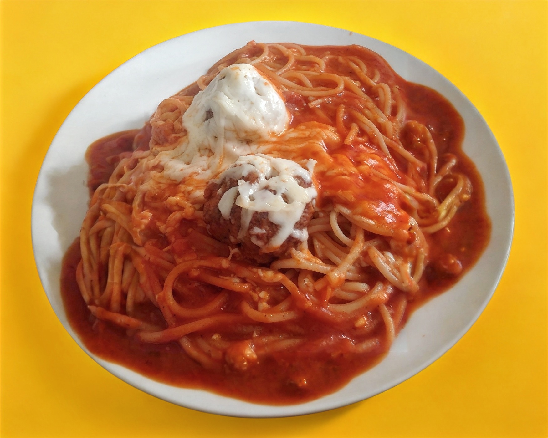 Espagueti, carne, salsa marinera, gratinado en queso, pan.