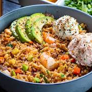Delicioso arroz a la plancha, acompañado de trocitos de zanahoria, calabacita, huevo, queso crema, aguacate, pimiento y tampico