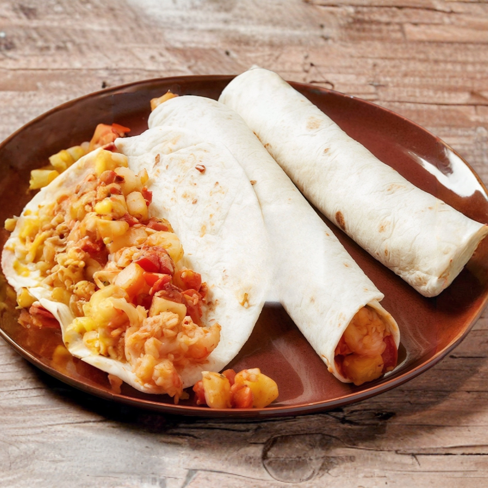 Burrito en tortilla grande de harina, con carne al pastor y piña.