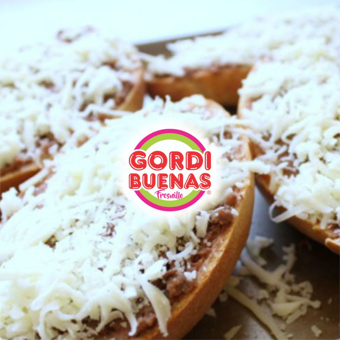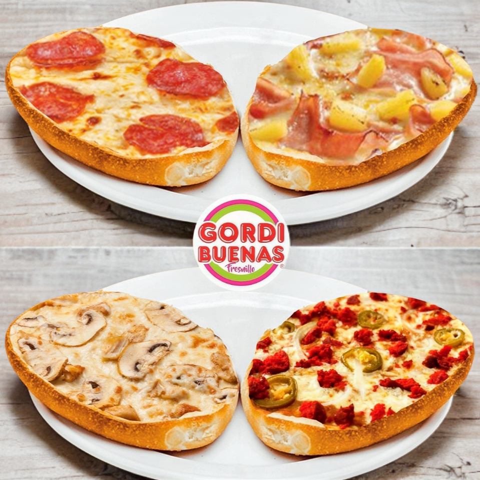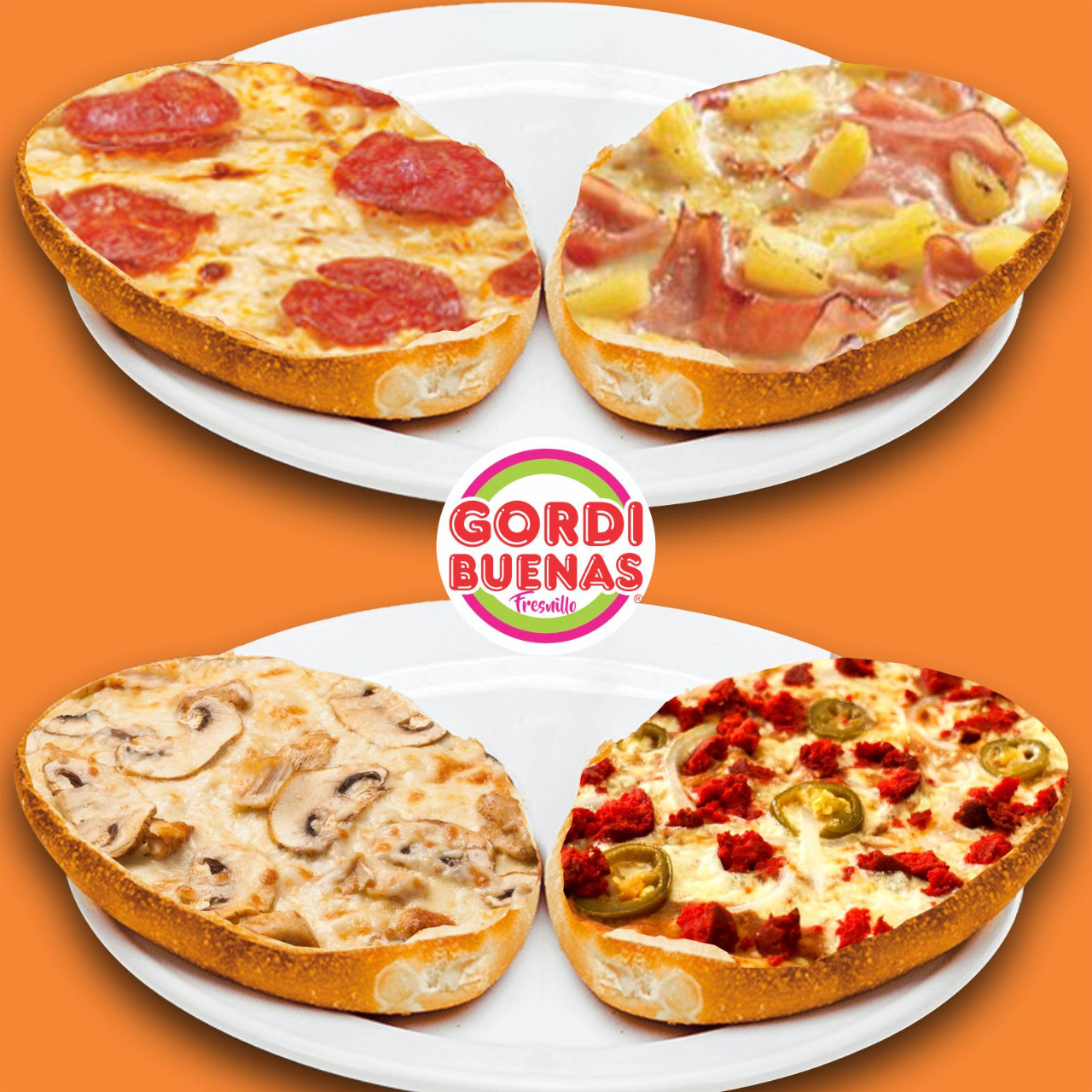 Medio bolillo con salsa para pizza, chorizo, cebolla, jalapeño y queso.