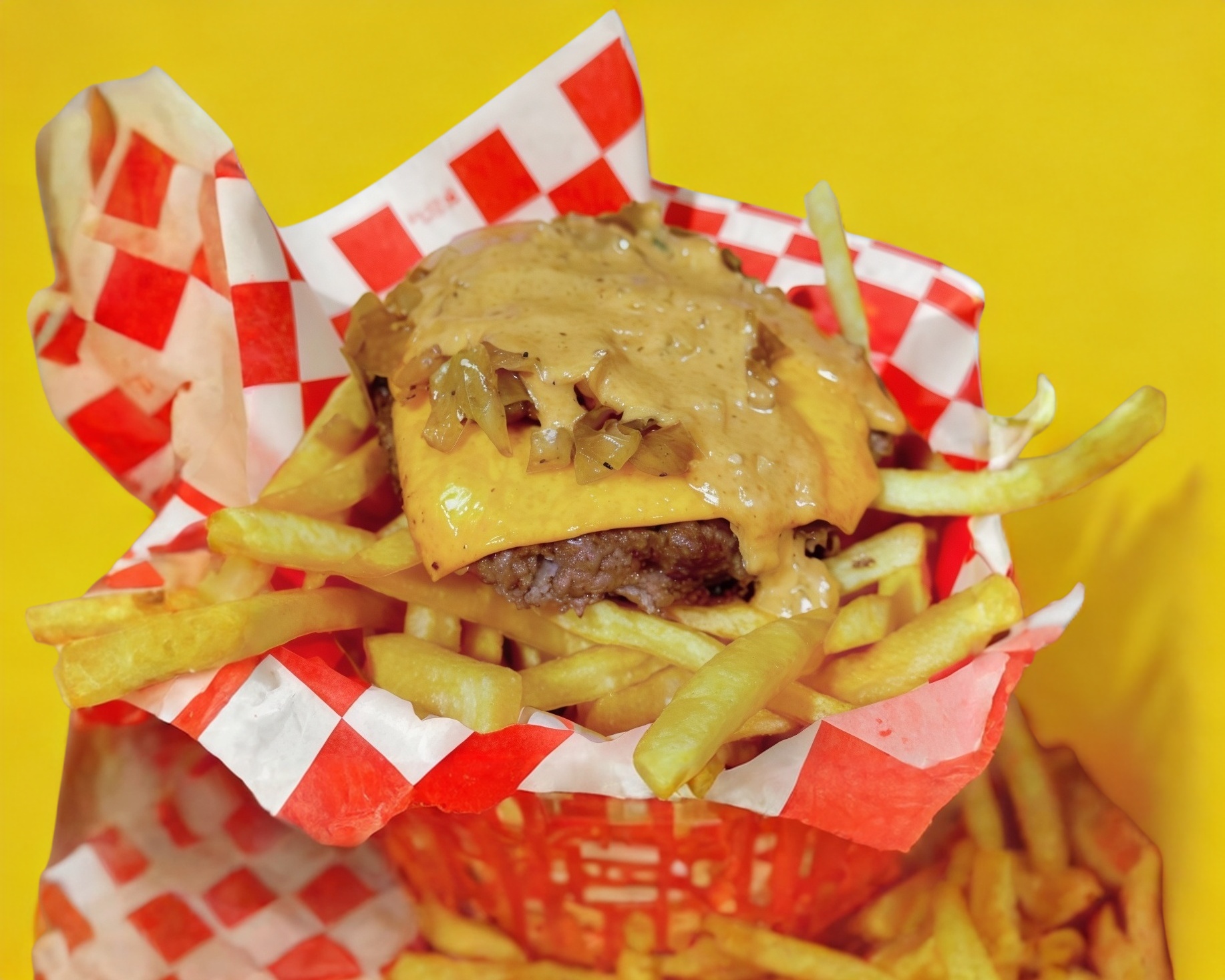 200 gramos de papas fritas, 100 gramos de carne, queso amarillo, aderezo grisy y cebolla caramelizada. Deli Deli...
