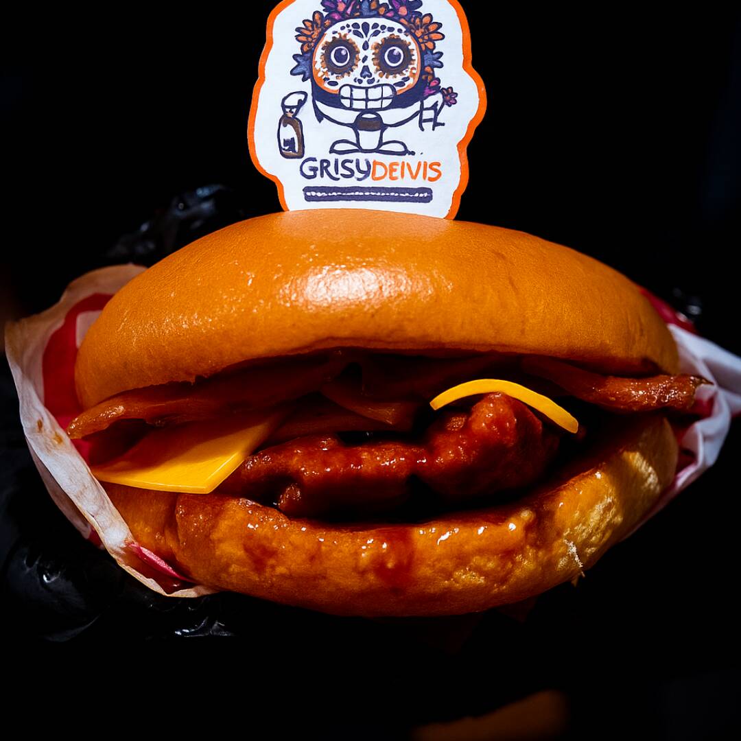 Pan brioche, pollo frito bañado en salsa bbq habanero y tocino. Jappy Jalogüin.