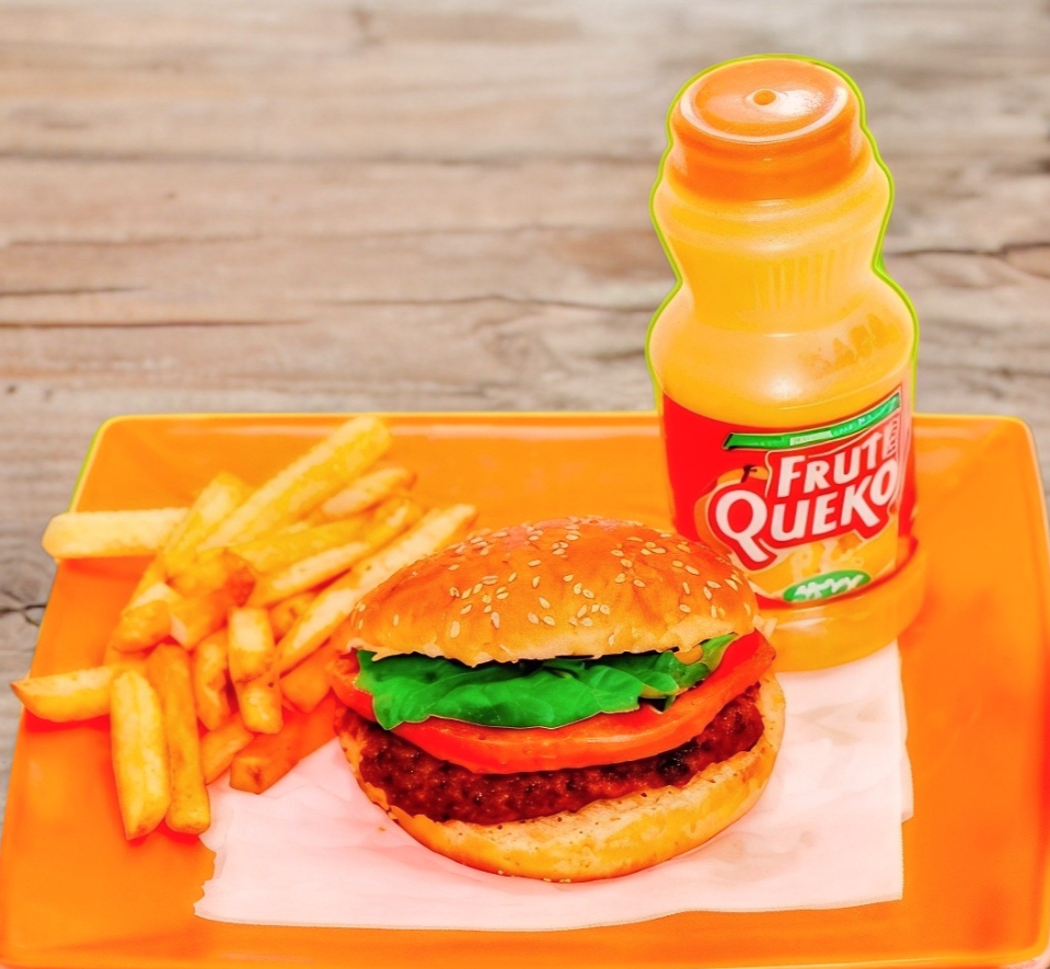 Hamburguesa mini, papas a la francesa y juguito.