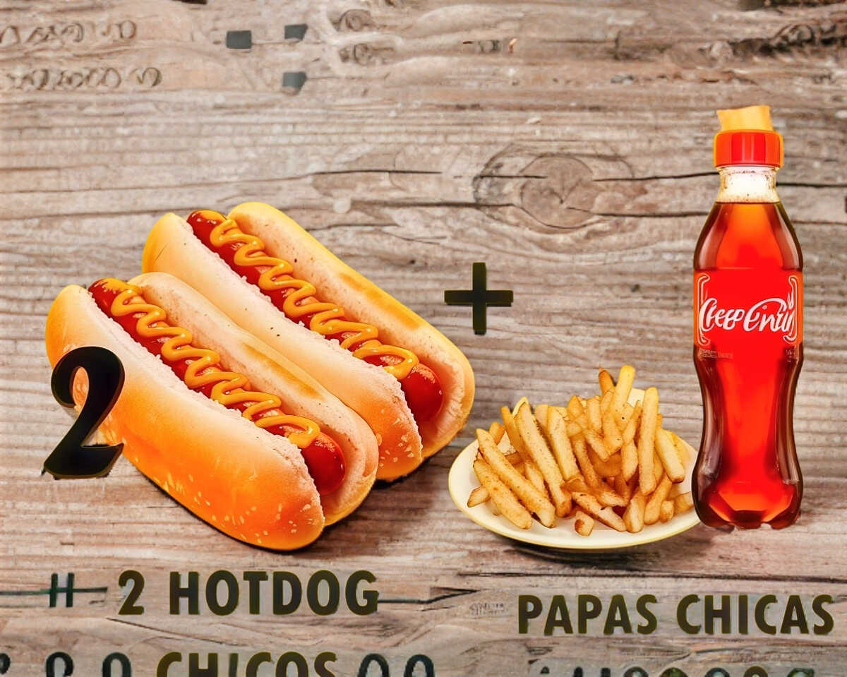 2 Hot dogs chico, papas chicas y refresco de 400 ml.