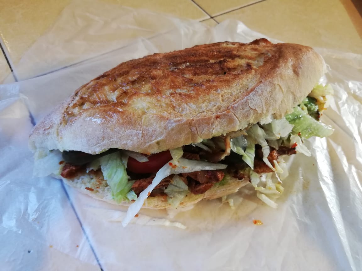 Carne al pastor, queso blanco, tocino, jamón, aguacate, mayonesa, cátsup, mostaza, lechuga, jitomate, cebolla y picante.