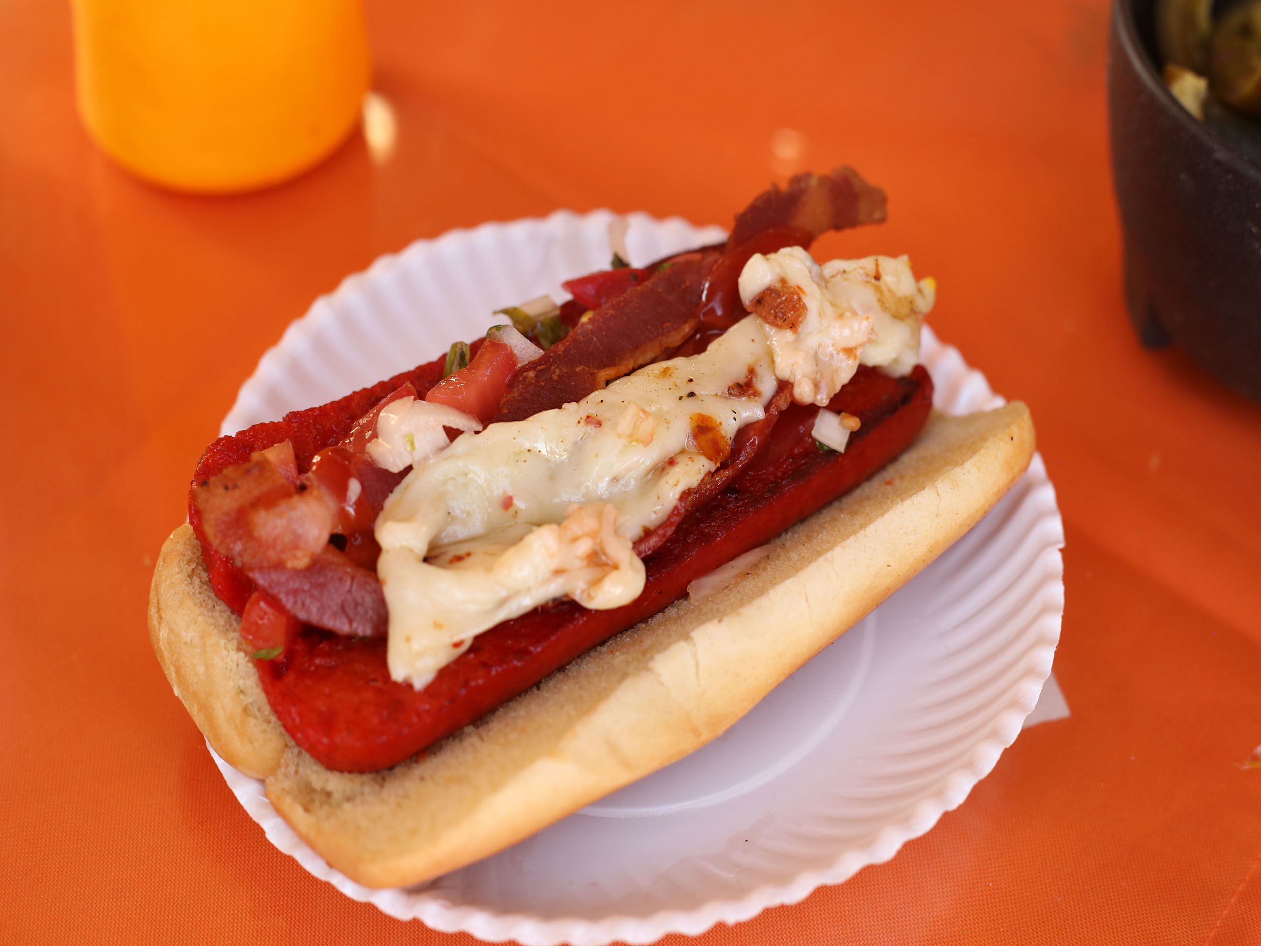 Carne, queso, salchicha frankfurt, gran porción de tocino, mayonesa, cátsup, mostaza, lechuga, jitomate, cebolla y picante.