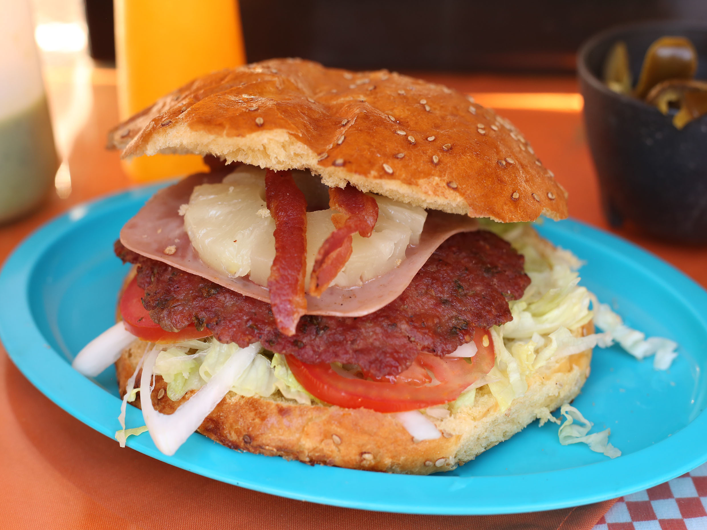 Carne, jamón, tocino, mayonesa, cátsup, mostaza, jitomate, cebolla picante y piña.
