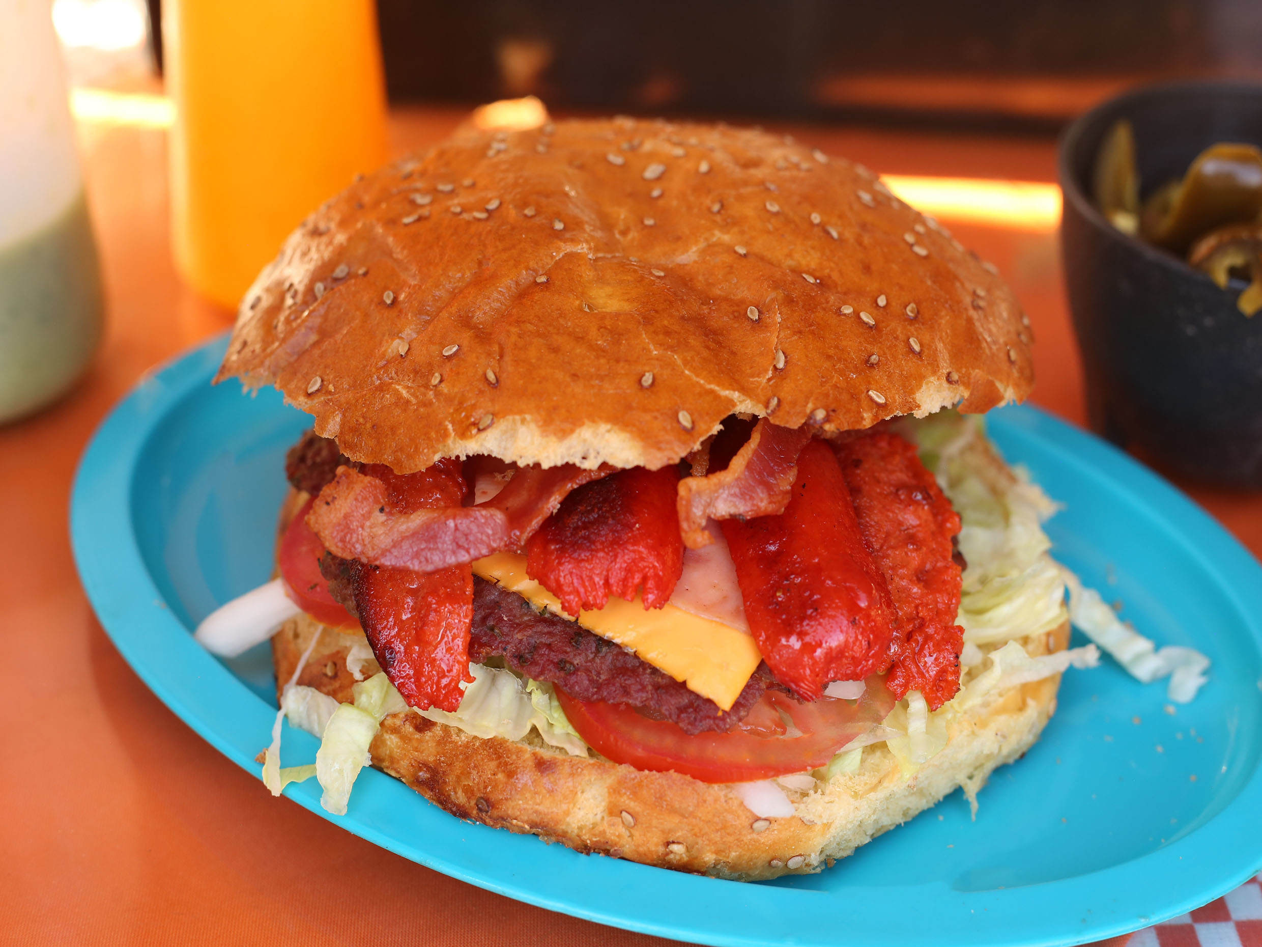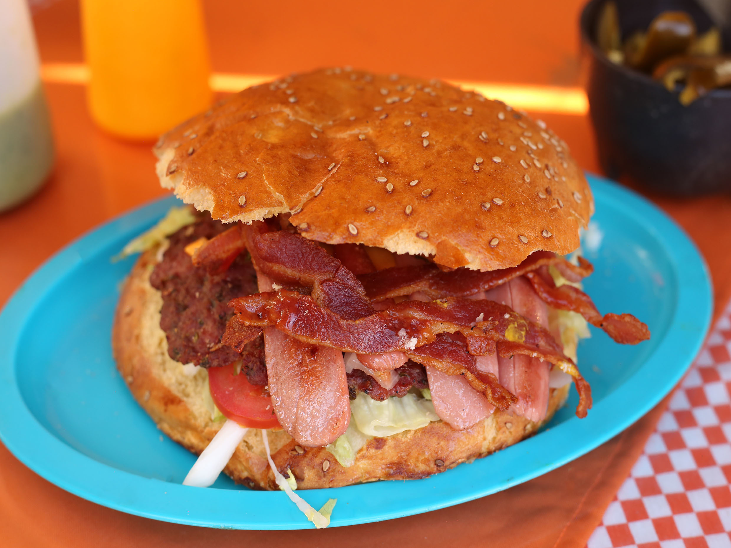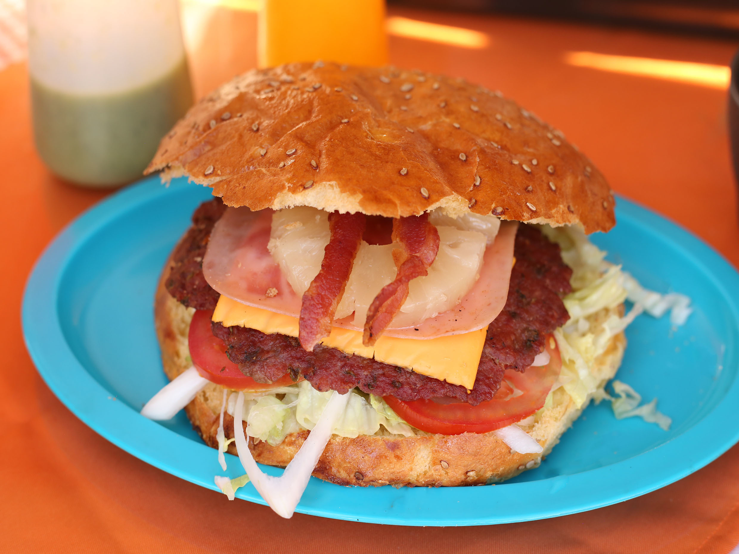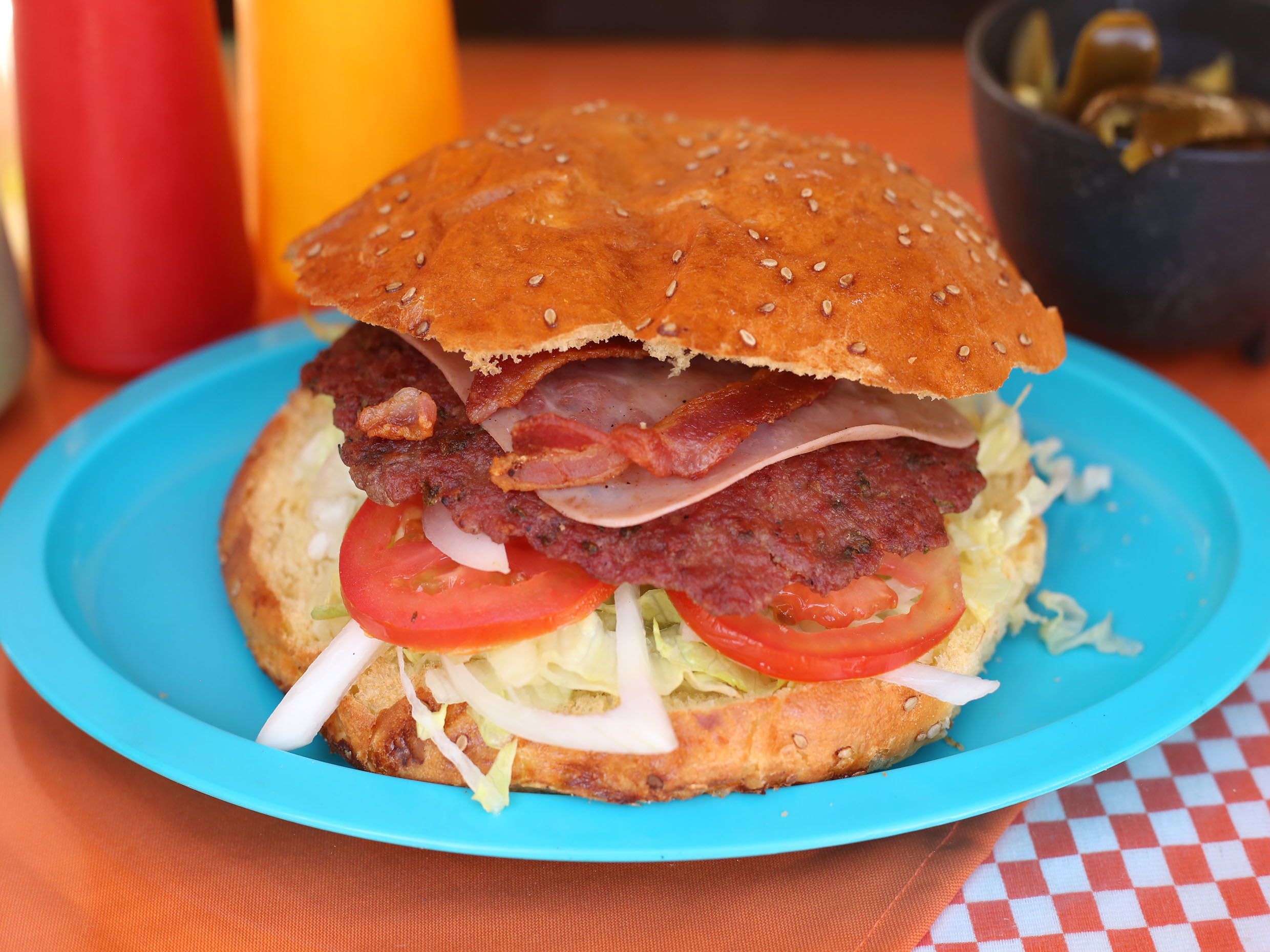 Doble carne, doble queso, jamón doble, doble tocino, mayonesa, cátsup, mostaza, lechuga, jitomate, cebolla y picante.