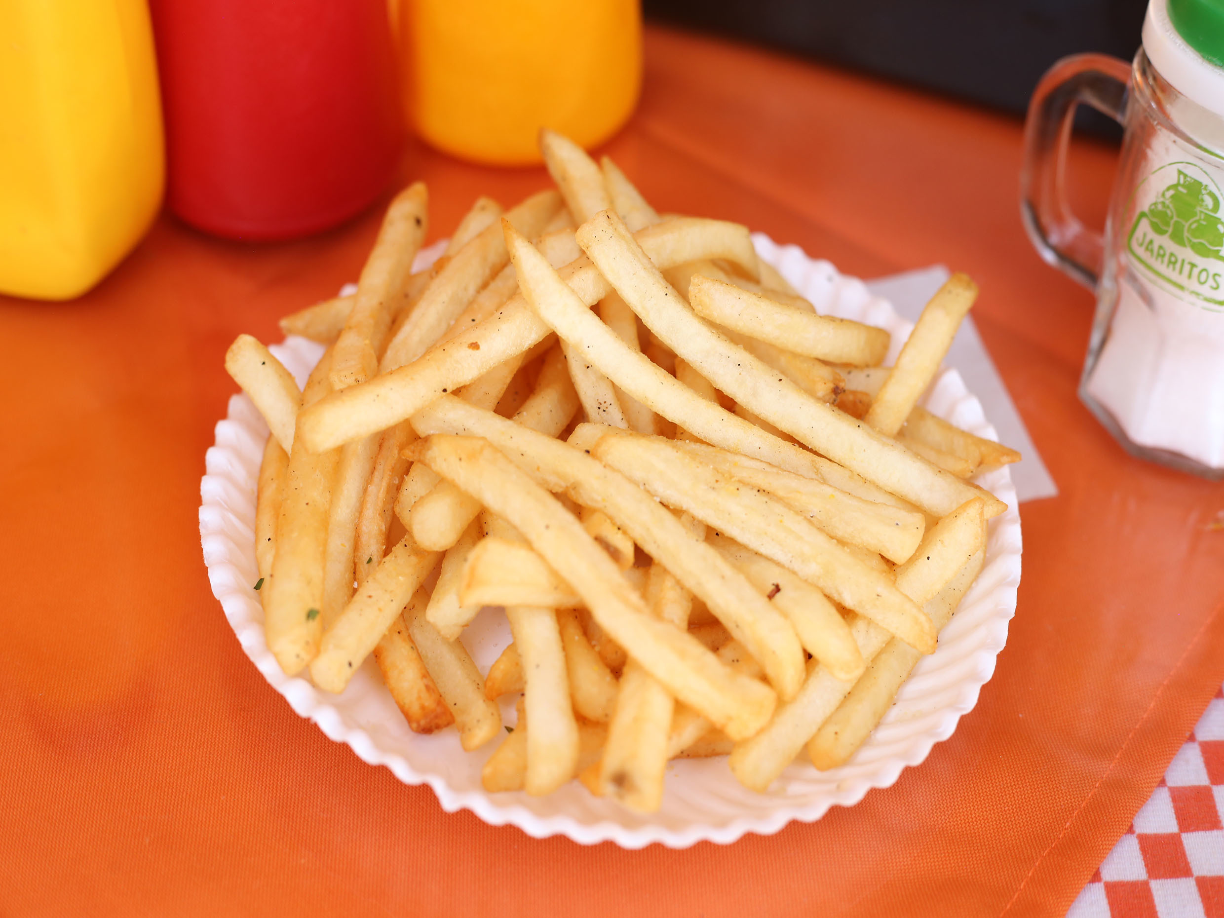 Papas, cátsup, mostaza y queso.