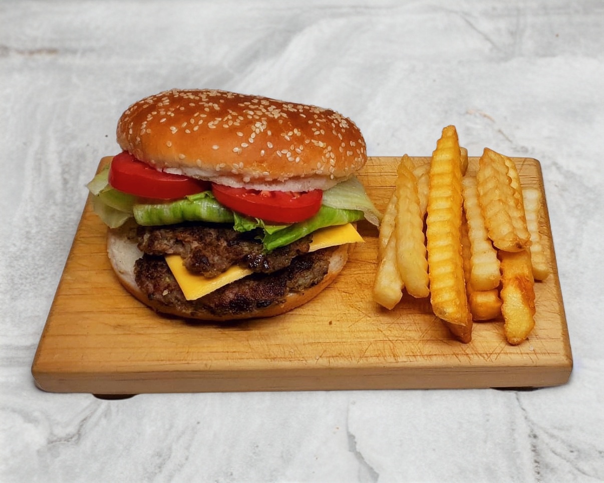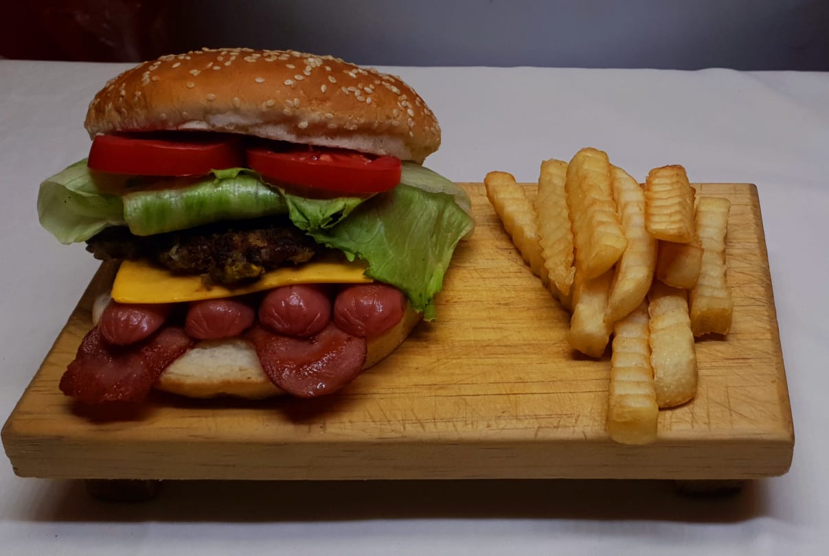 1 Hamburguesa Con queso amarillo, 100gr de carne de res, 1 salchicha en trozos, 2 rebanadas de tocino, cebolla, tomate, lechuga, chile y salsas.