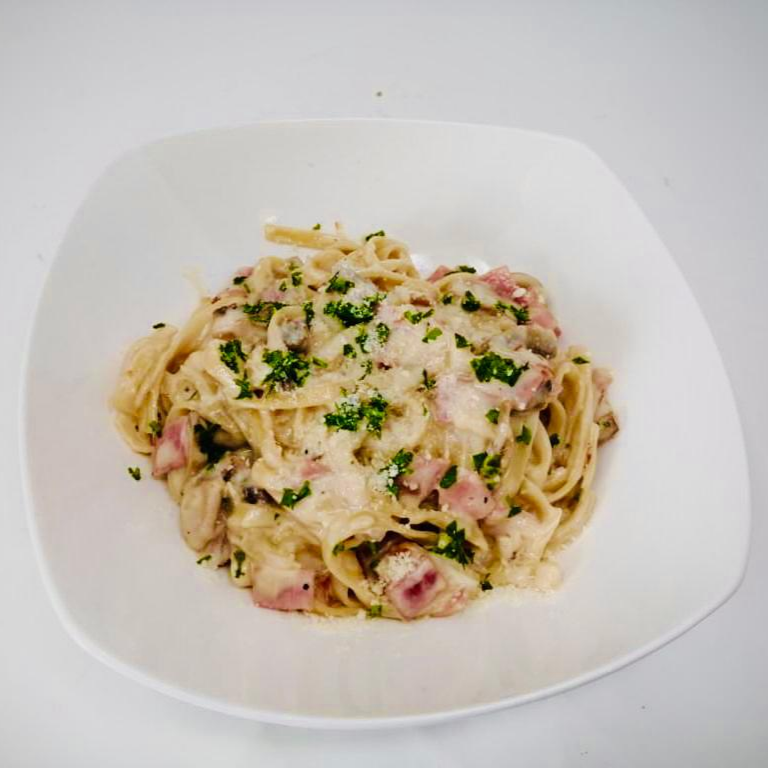 Deliciosos Tallarines bañados en salsa Alfredo, combinados con jamon de pierna, champiñones