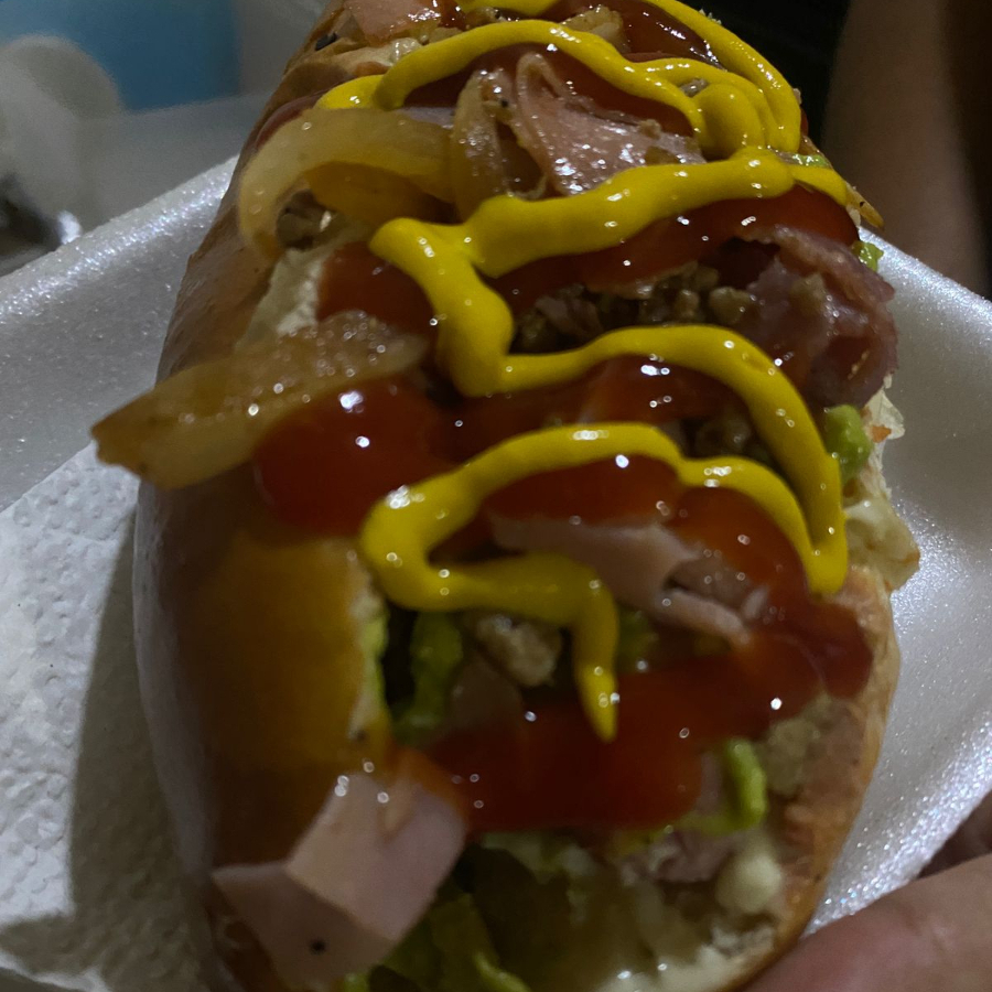 Delicioso trocho preparado con salchicha, mayonesa, guacamole y jamón con tocino.