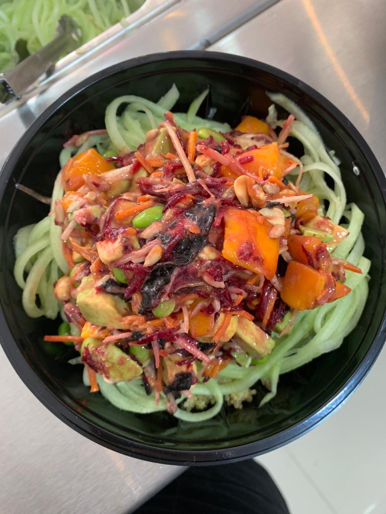 Base: noodles de pepino. Toppings aguacate, edamame, pimiento, brócoli y betabel, aderezos: thai especial, salsa de mango, ponzu, salsa de ajonjoí. Crunch: semilla de girasol y semillas de calabaza.