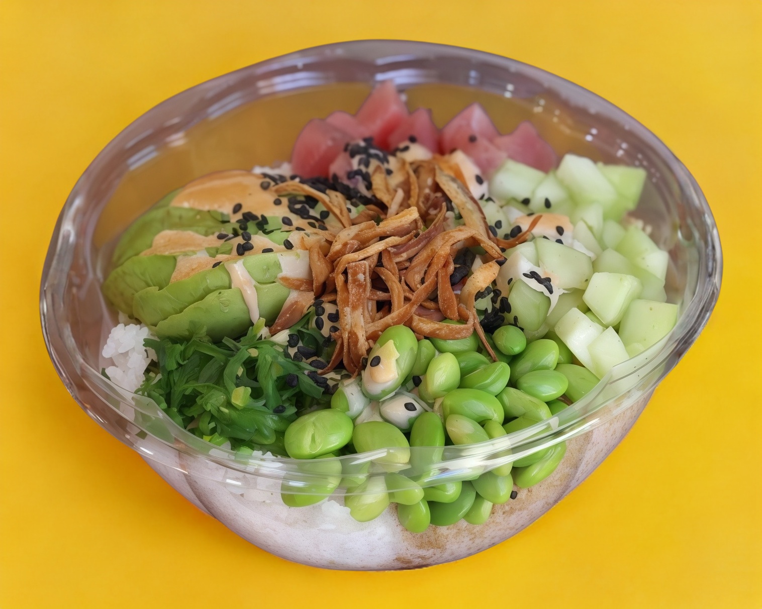 Base: quinoa y arroz. Proteína: atún. Toppings: edamame, aguacate, pepino, seaweed, vinagreta oriental, sweet & spicy. Crunch: cebolla y ajonjolí negro.