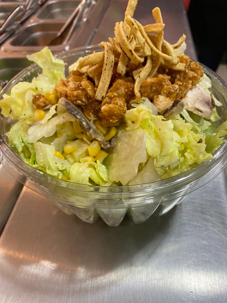 Lechuga, Pollo BBQ, champiñón, elote, queso manchego, ranch cilantro jalapeño y tiritas de maíz