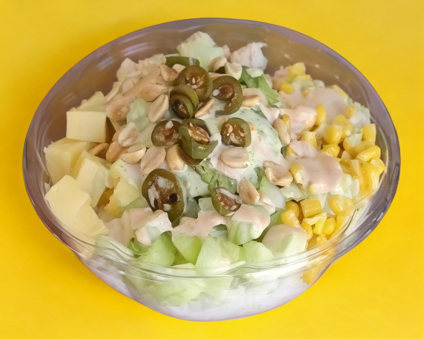 Base: arroz y noodles de pepino. Proteína: pollo en salsa de alitas. Toppings piña, zanahoria, champiñón, queso philadelphia. Aderezos: vinagreta oriental, salsa de mango. Crunch de aguacate.