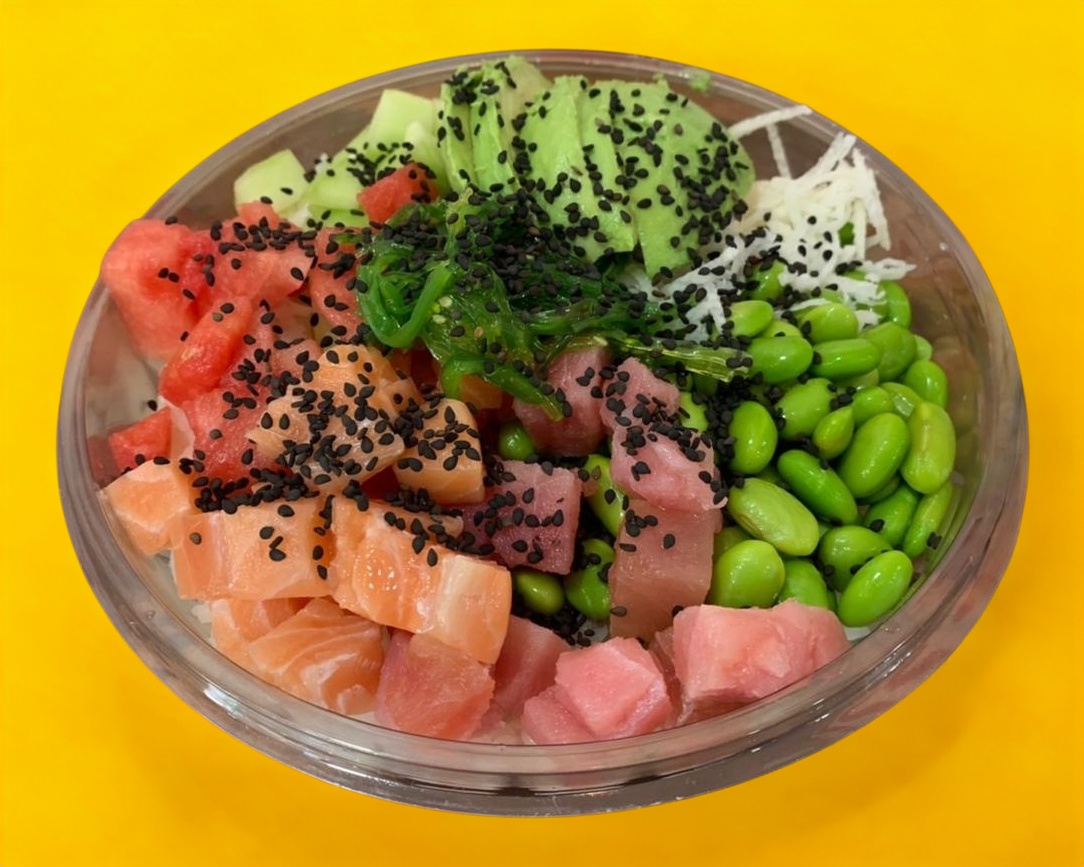 Base: arroz. Proteína: atún y salmón. Toppings: seaweed, pepino, sandía, aguacate, jícama y edamame. Aderezos: salsa de cacahuate, ponzú y thai especial. Crunch: ajonjolí negro.
