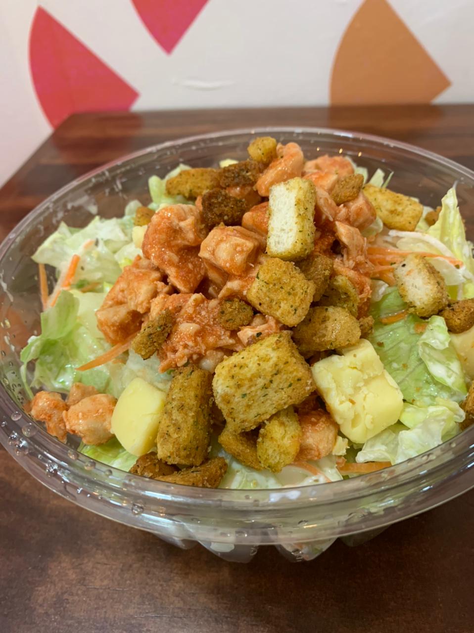 Lechuga, pollo en salsa de alitas, jícama, apio, zanahoria, queso chihuahua, aderezo ranch y crotones.