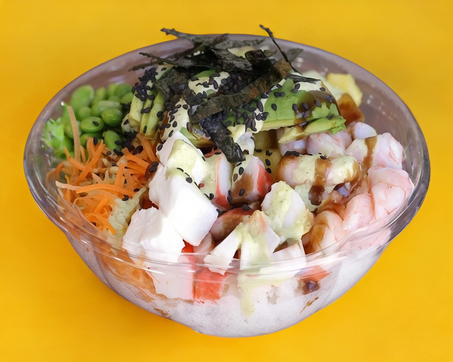 Base: arroz. Proteína: camarón y surimi. Toppings: pepino, aguacate, edamame, zanahoria, piña, y queso philadelphia. Aderezos: teriyaki, ranch de cilantro y jalapeño. Crunch alga.