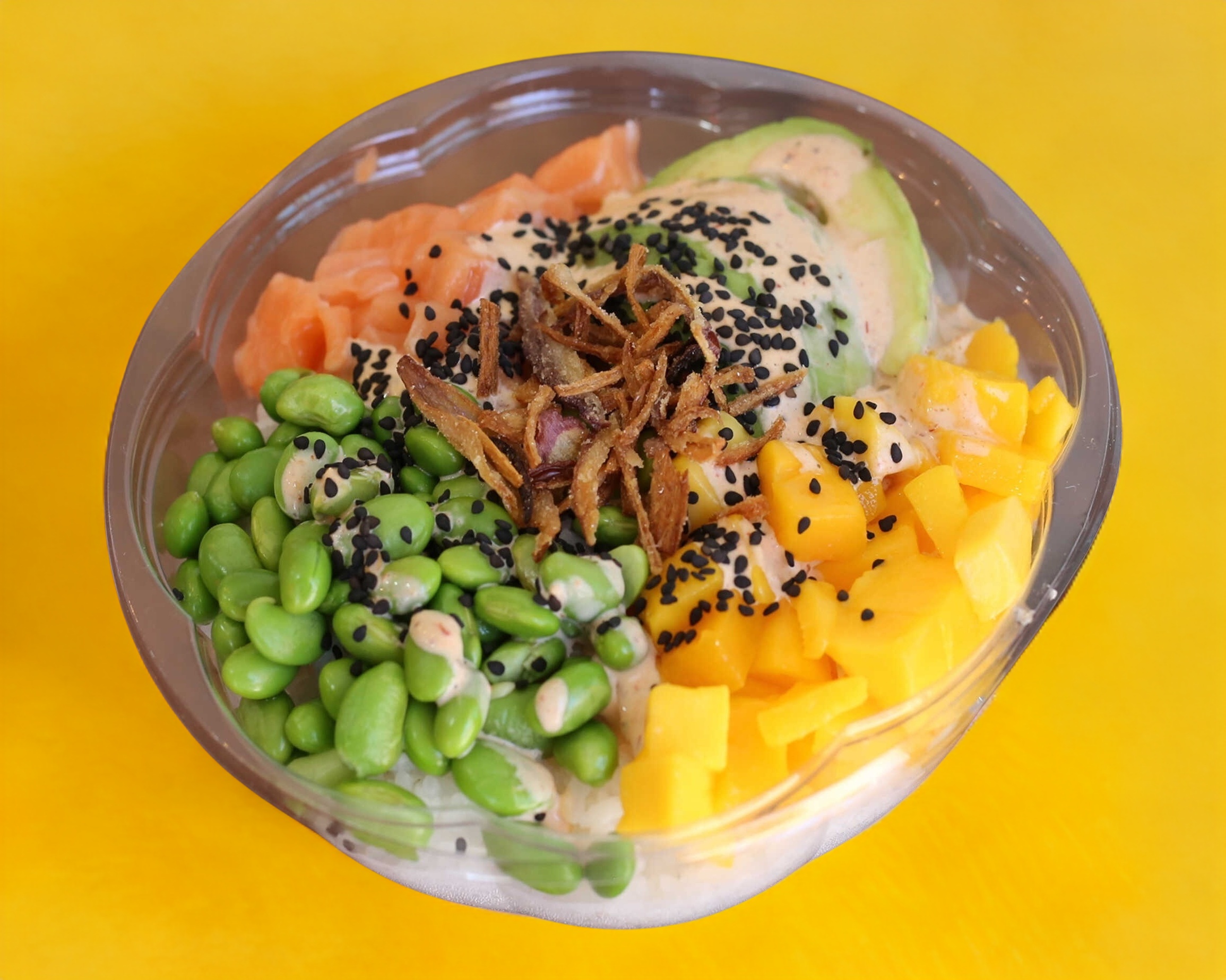 Arroz, salmón, edamame, mango, aguacate, chipotle, ponzu, cebolla crunch, ajonjolí negro