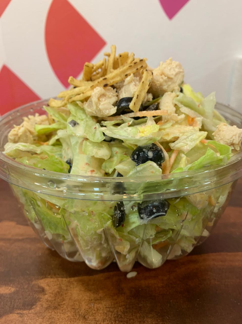 Lechuga, Pollo a la plancha, pepino, aceituna negra, zanahoria, chipotle y tiritas de maíz