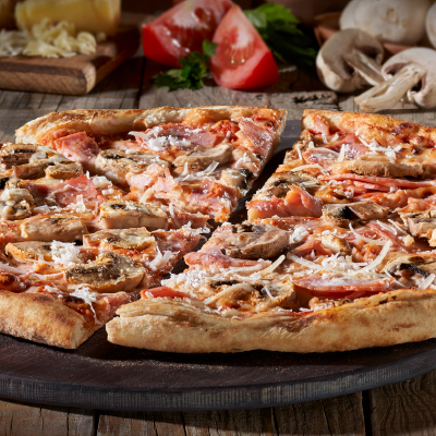 Combinación de salsa Pomodoro, queso Mozarella, jamón (50 g), champiñones picados, crema dulce y Parmesano.