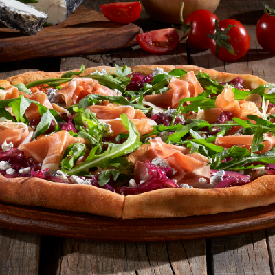 Prosciutto (jamón serrano) (30g), arúgula, cebolla al vino tinto y un toque de queso Cenizo de Cabra.