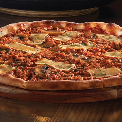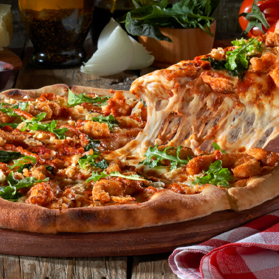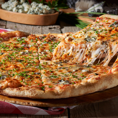Acompañada de nuestra clásica salsa Pomodoro, queso Mozzarella y queso Gorgonzola, espinaca, pechuga sazonada (127 g) y un toque de salsa pesto de chipotle, espolvoreados de queso Parmesano croccante.