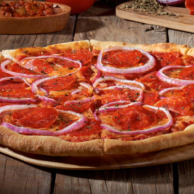 Abundante porción de Pepperoni (40 g), queso Mozzarella fresco y aros de cebolla morada.