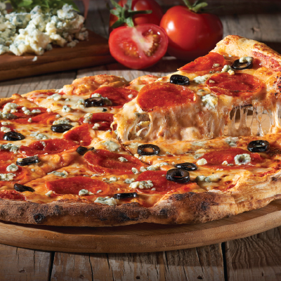 Saborea nuestro tradicional Pepperoni (30 g) acompañado de salsa Pomodoro, Mozarella, queso Gorgonzola, aceitunas negras.
