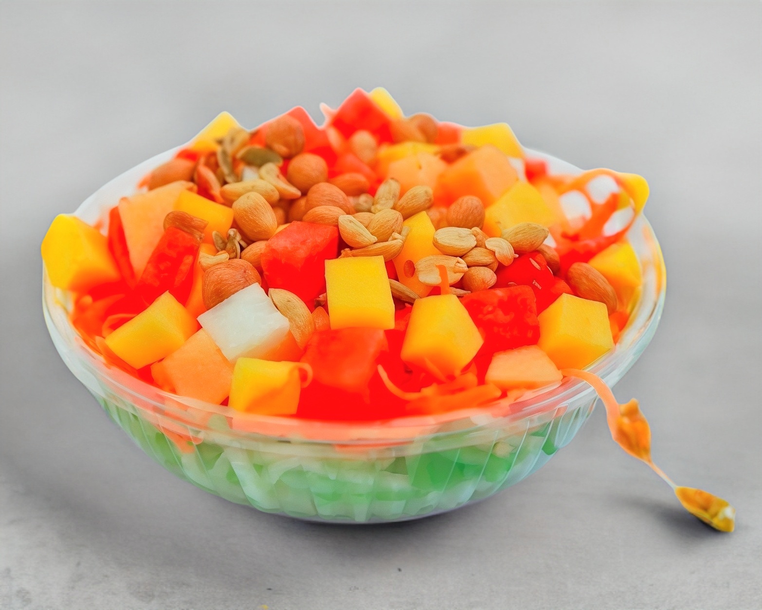 Raspado de frutas naturales, fresa, mango, chamoy, nuez, sandía, coco, mix de cereales de la casa y lechera, porción individual.