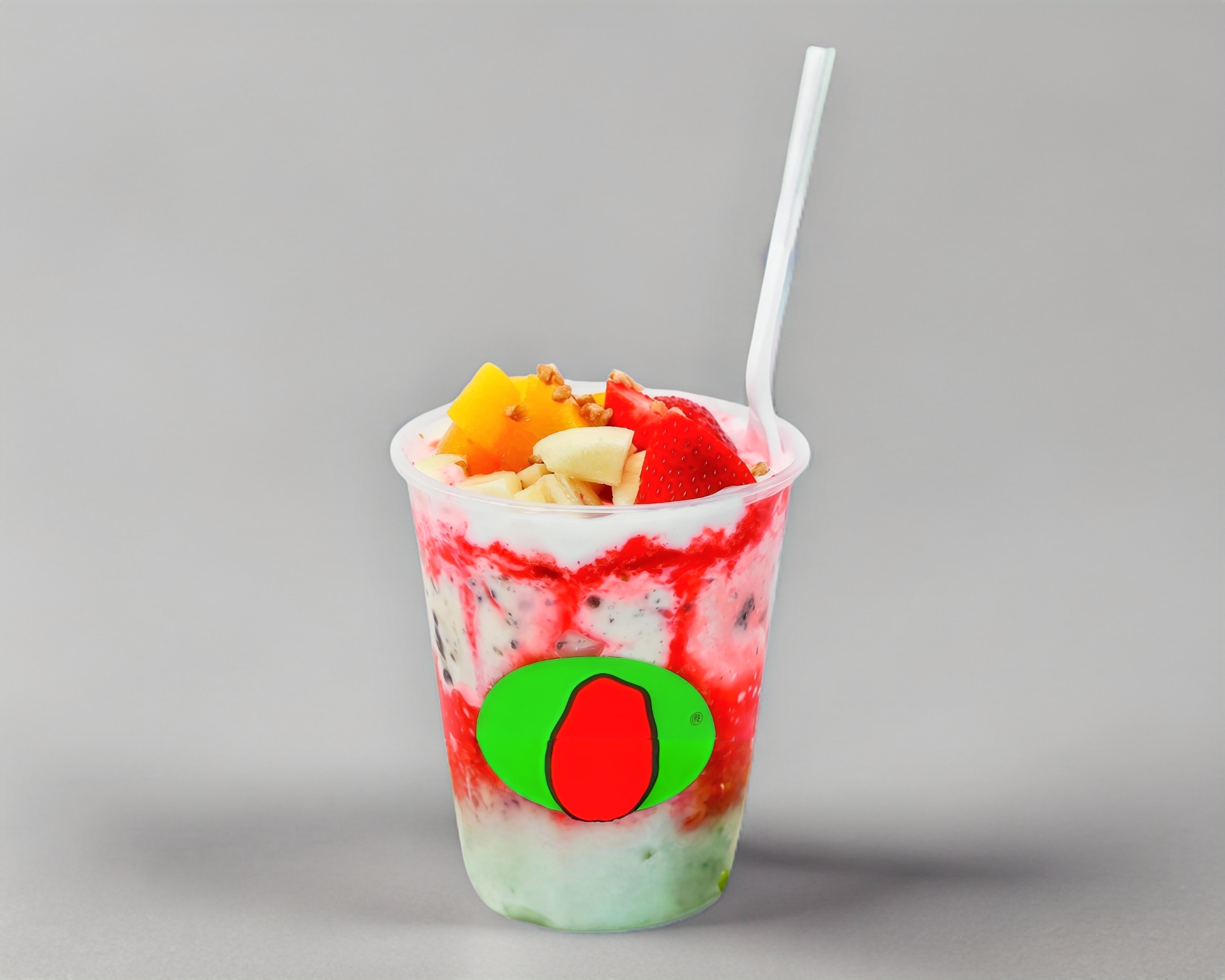 500 g De mango, fresa, fresa, zarzamora, plátano, durazno, helado, mix de cereales de la casa y chocolate líquido.