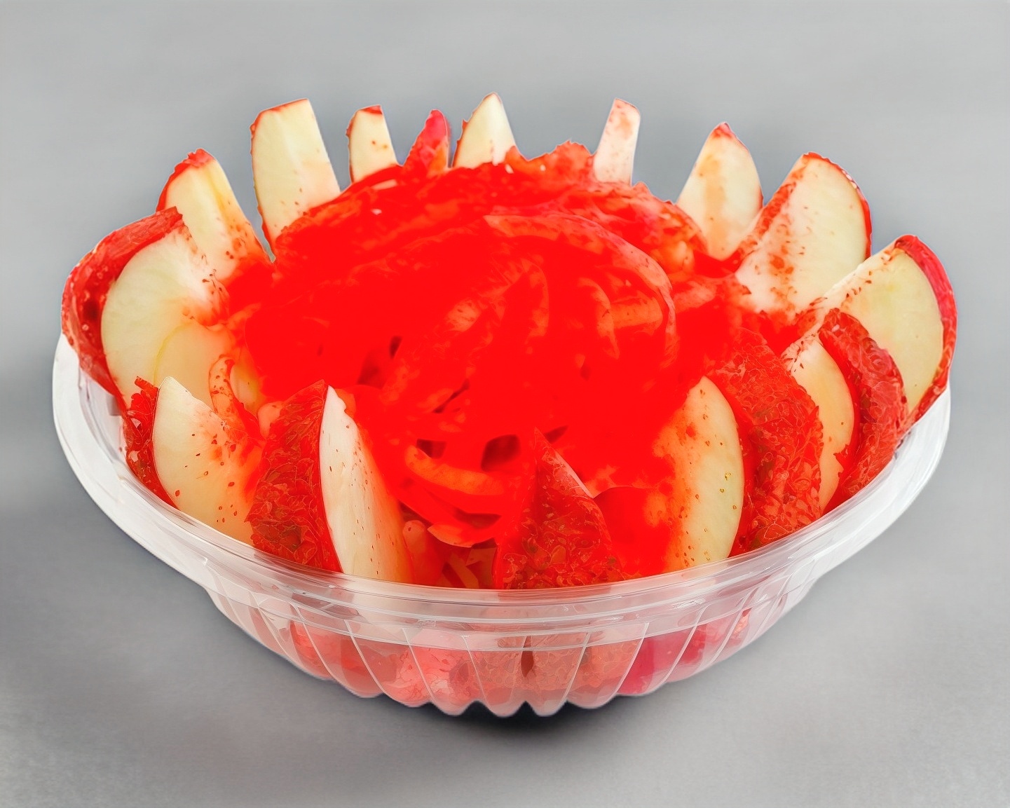 Manzana cubierta con pasta de chamoy acompañada de jicama, zanahoria y pepino rayados.