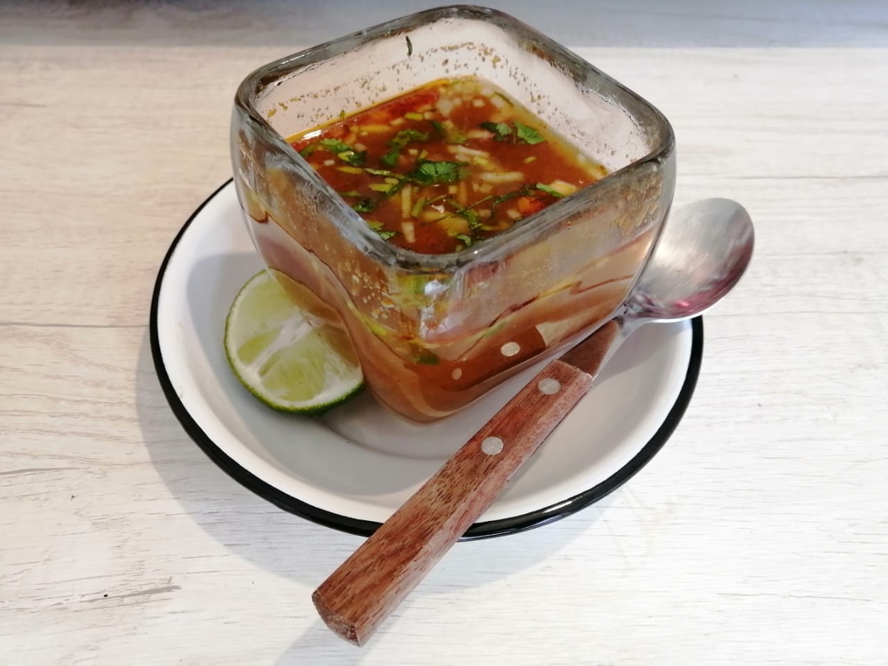 Cebolla, tortillas, 2 tipos de salsas, limones y consomé.