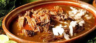 Mezcla de consomé, birria asada, cebolla asada, fideos, machito, aguacate y queso gratinado.