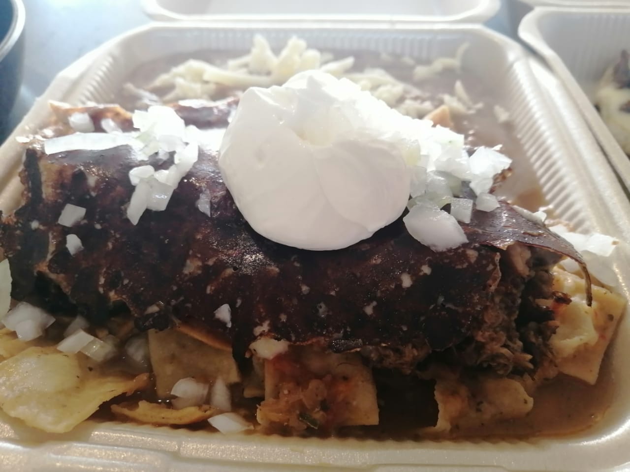 Con frijoles, costra de queso, cilantro y cebolla.