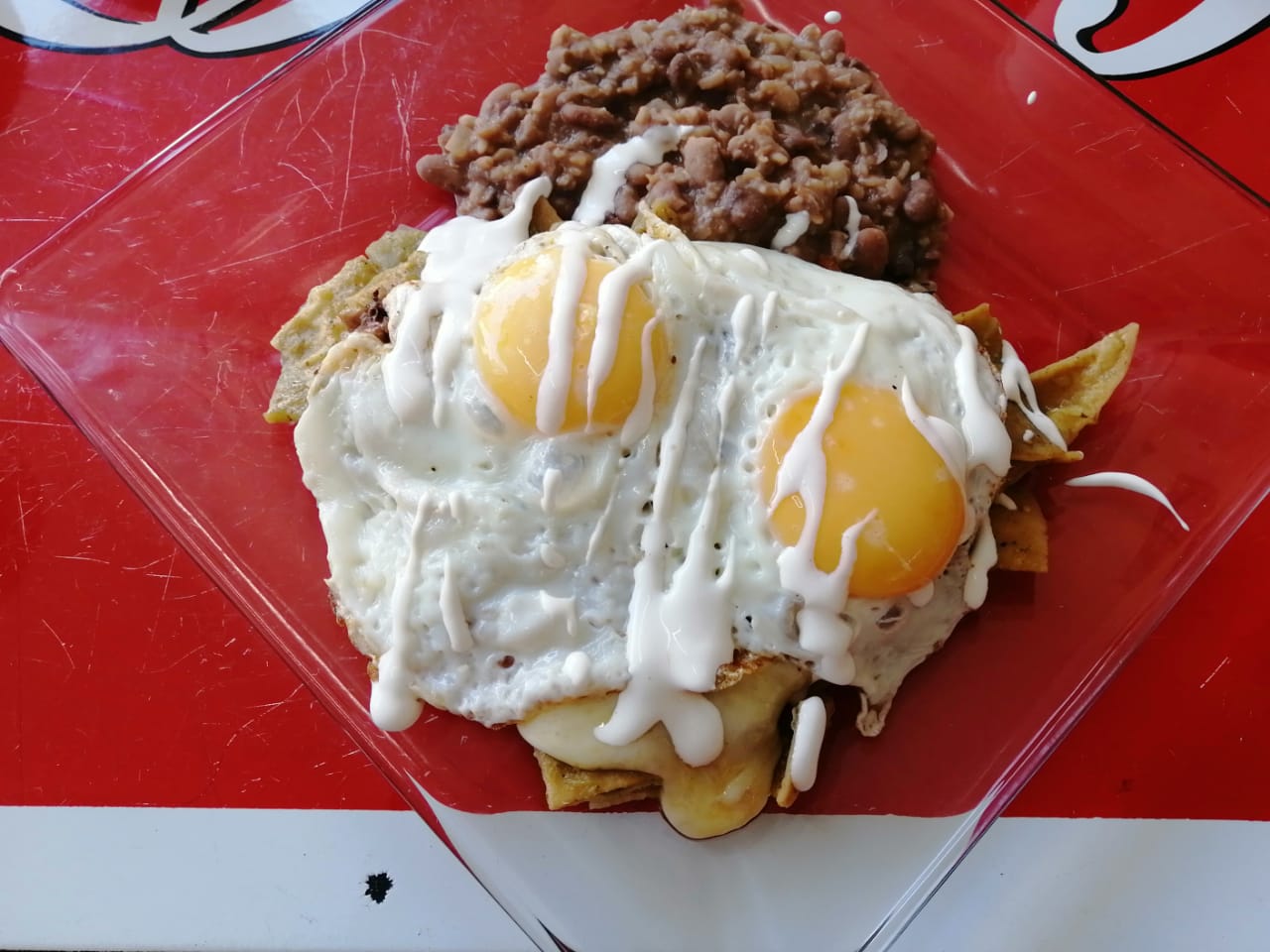 Par de huevos fritos sobre 2 volcanes de frijol con queso, bañados con salsa verde y roja con yesca, coronados con crema y queso