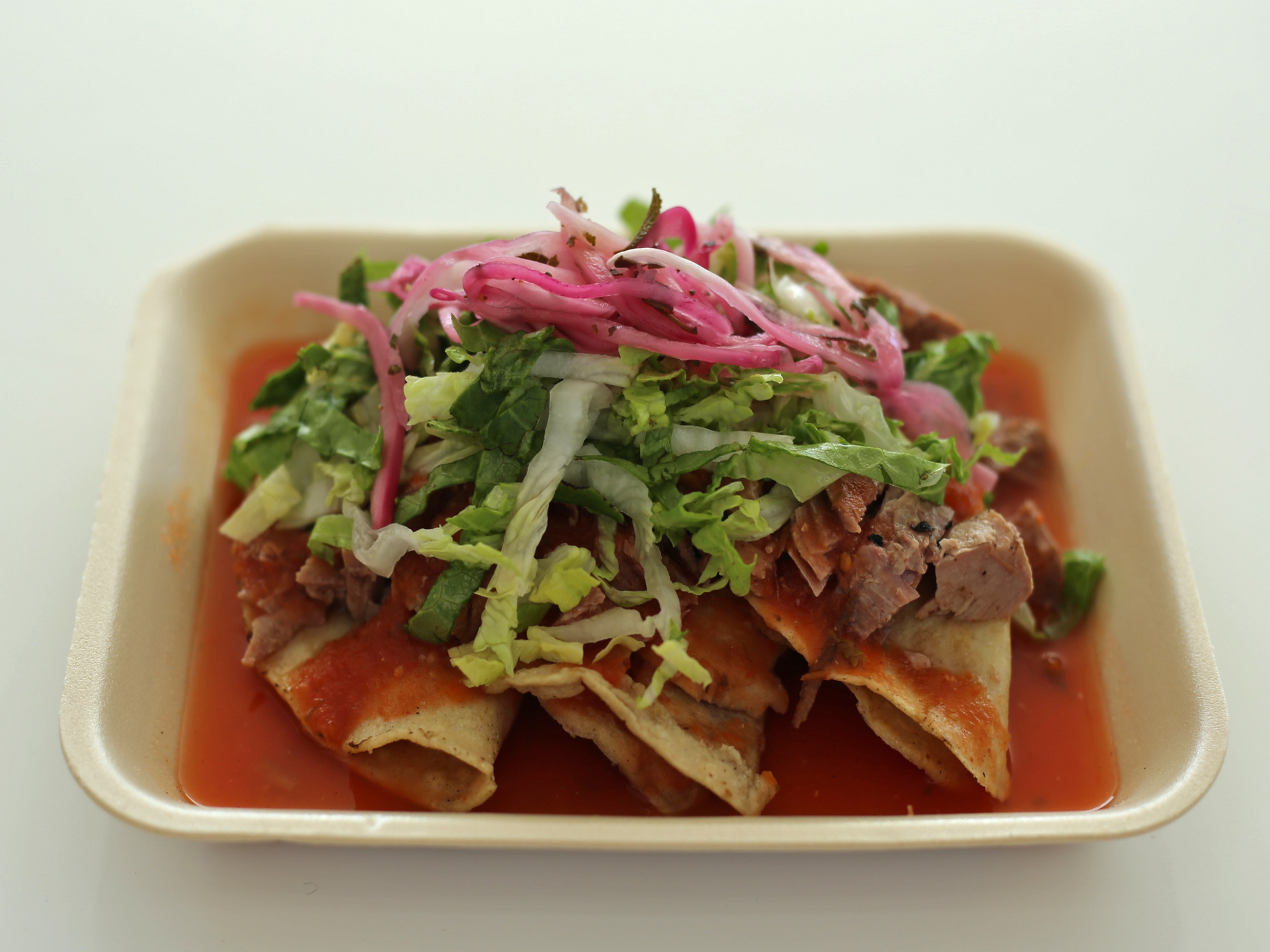 Delicioso taco dorado (1 pza), relleno de papa, con carnitas bañado en una salsa de jitomate, acompañada de cebolla morada.