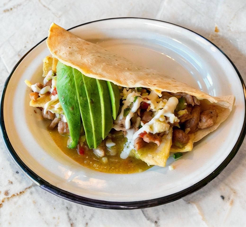 Tortilla de harina con queso mozzarella, chilaquiles rojos o verdes, aguacate, queso fresco y crema.