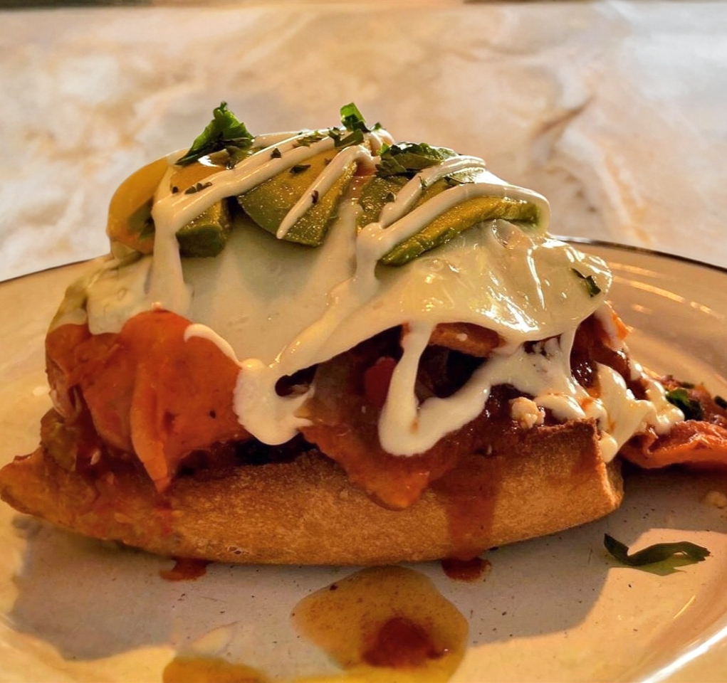 Con queso gouda, frijoles, chilaquiles rojos o verdes, pico de gallo y crema.