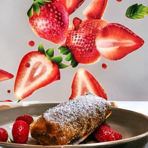 Nuestro Pie frito elaborado con nuestro relleno de mermelada de fresa hecha por nosotros, espolvoreado con azúcar.