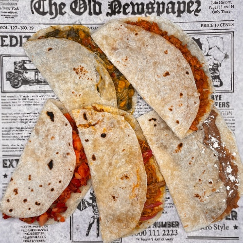 Una orden de tacos completa paseados estilo Monterrey con nuestros guisados estrella (1 Papas con chorizo, 1 Rajas, 1 Frijoles 1 Yesca y 1 de Cochinita Pibil) con tortillas de mantequilla hechas al momento y fritas en aceite.