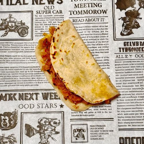 Deliciosa tortilla de harina hecha al momento, paseado estilo Monterrey relleno rajas con elote.