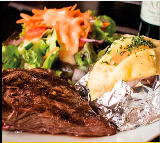 1Kg arrachera, 2 papas al horno, ensalada mixta, salsas y elegir término.