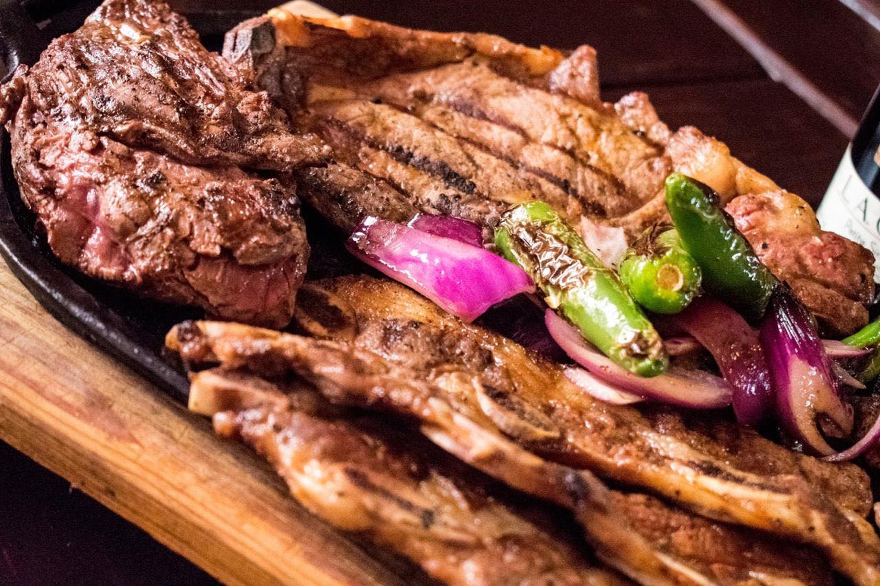 2 personas: Arrachera, costilla, chorizo argentino, chistorra, papa al horno y ensalada mixta.