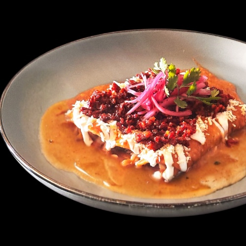 Deliciosos chilaquiles bañados en salsa de mole , acompañados por frijol refrito, crema, queso fresco, cebolla encurtida y nuestro famoso pan de ajo.