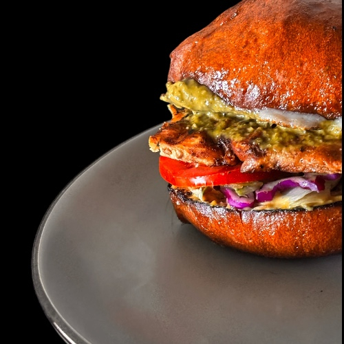 Pechuga de pollo, pan cubano, queso panela al grill, tomates al grill y nuestro pesto casero. Imperdible experiencia.