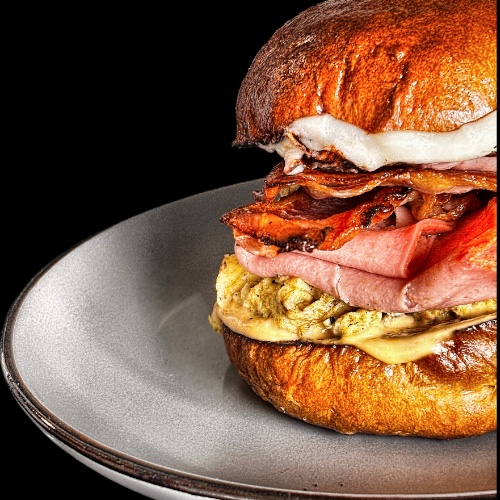 Delicioso slider cocinado con mantequilla, huevo revuelto, tocino crujiente, queso oaxaca y jamón dorado en sartén, acompañado por papas fritas de la casa.